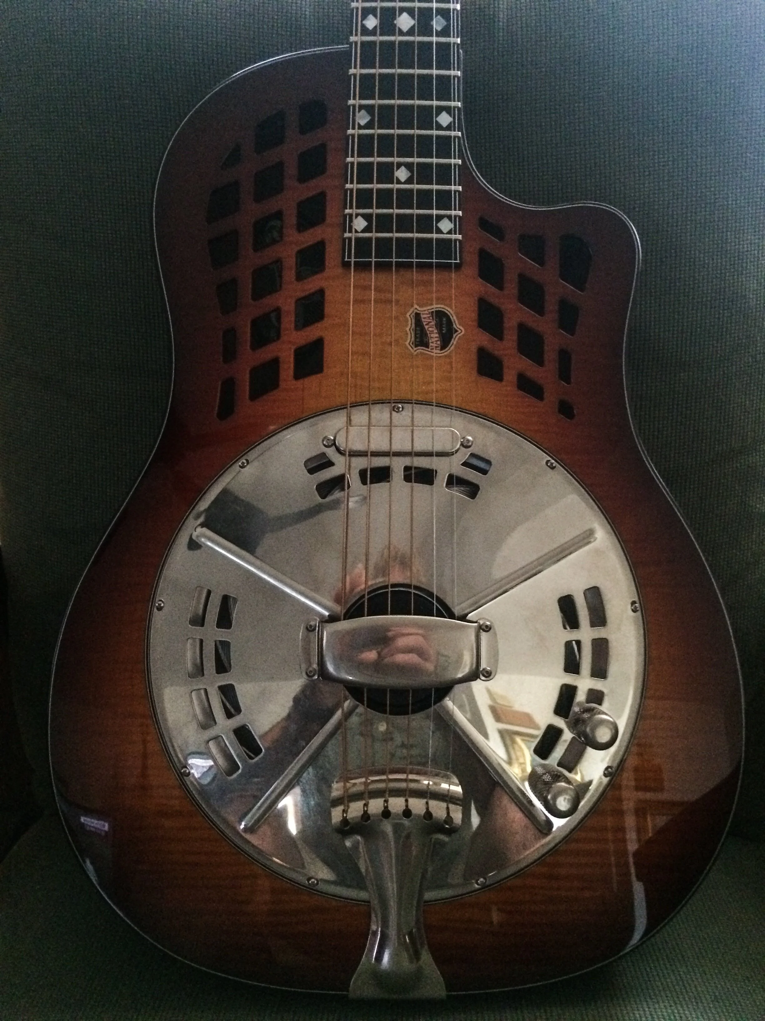 I completed a design for National guitars a while back on an M14 guitar for a Namm show, featuring a custom one off paint job that I did for them. Starting with an M14 guitar which is a deeper body, it was finished in a midnight blue color including the neck and peghead. I then painted the scene on the guitar to keep somewhat in the tradition of the originals with palm trees and a serenading musician in a boat, but with a more modern twist. The entire color scheme of the guitar was to reflect a moonlight scene.The body was then clear coated and assembled by National Guitars and featured in the Namm show in California. The guitar has been sold, but It is featured on their website under the Custom Guitars section and is called the "Corso Custom" resonator guitar.